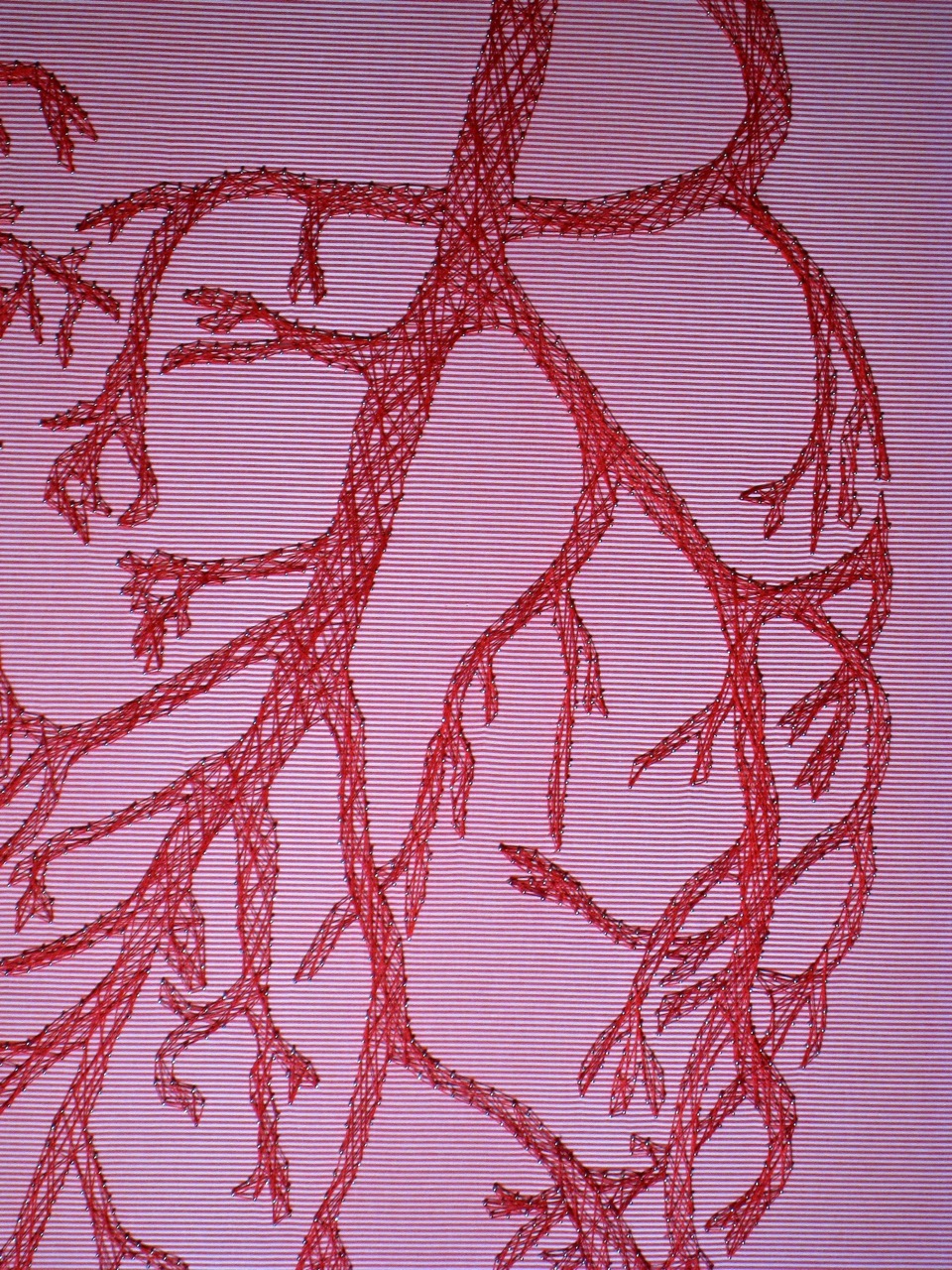 Deux plaques de polystyrène de construction, 140 x 140 cm de cotonnade rayée, 300 gr d'aiguilles de 20 mm, plusieurs centaines de mètres de cordonnet rouge.